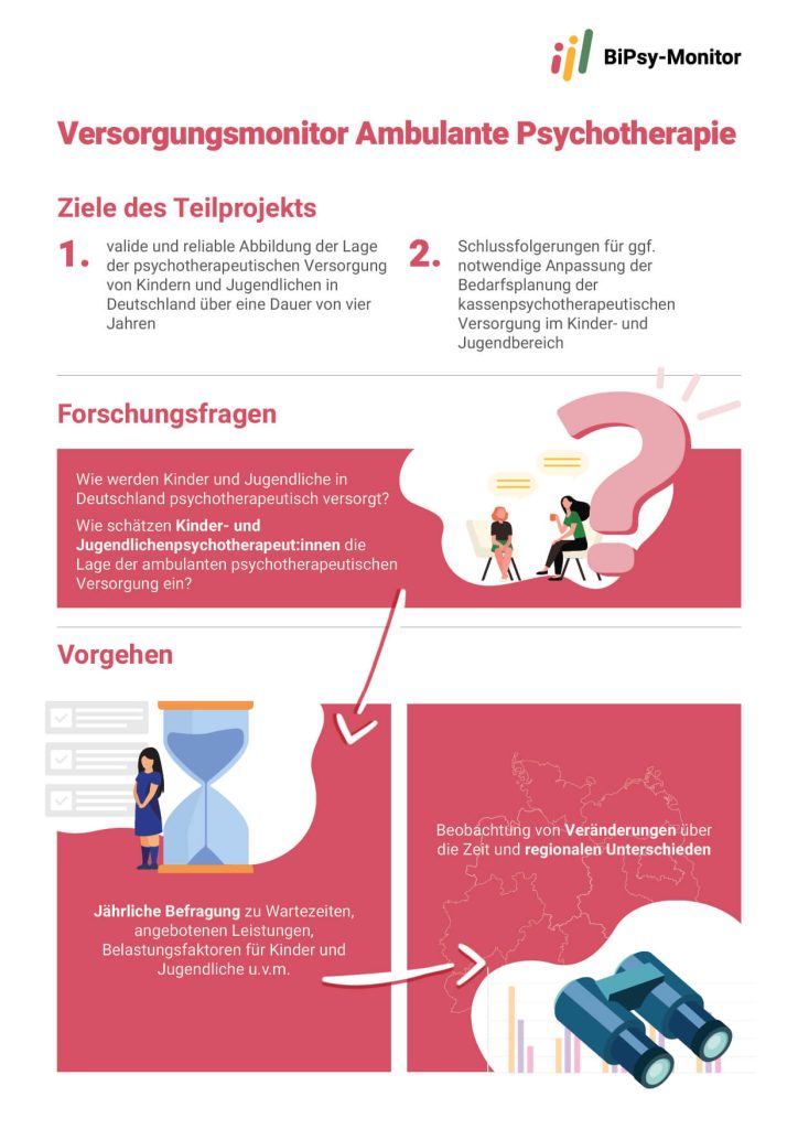 Im BiPsy-Versorgungsmonitor wollen wir kontinuierlich über einen Zeitraum von vier Jahren die ambulante psychotherapeutische Versorgung von Kindern und Jugendlichen in Deutschland aus der Sicht von psychotherapeutischen Versorger:innen erfassen. In jährlichen bundesweiten Befragungen befragen wir Psychotherapeut:innen zu Anfrageaufkommen, Wartezeiten, wahrgenommenen Belastungsfaktoren für Kinder und Jugendliche, Barrieren in der Inanspruchnahme von psychotherapeutischer Unterstützung und vielem mehr. Ziel ist es dadurch ein umfassendes bedarfsorientiertes Bild der Versorgungssituation zu erhalten und damit datengestützt eine Reform der derzeitigen Bedarfsplanung anzustoßen.